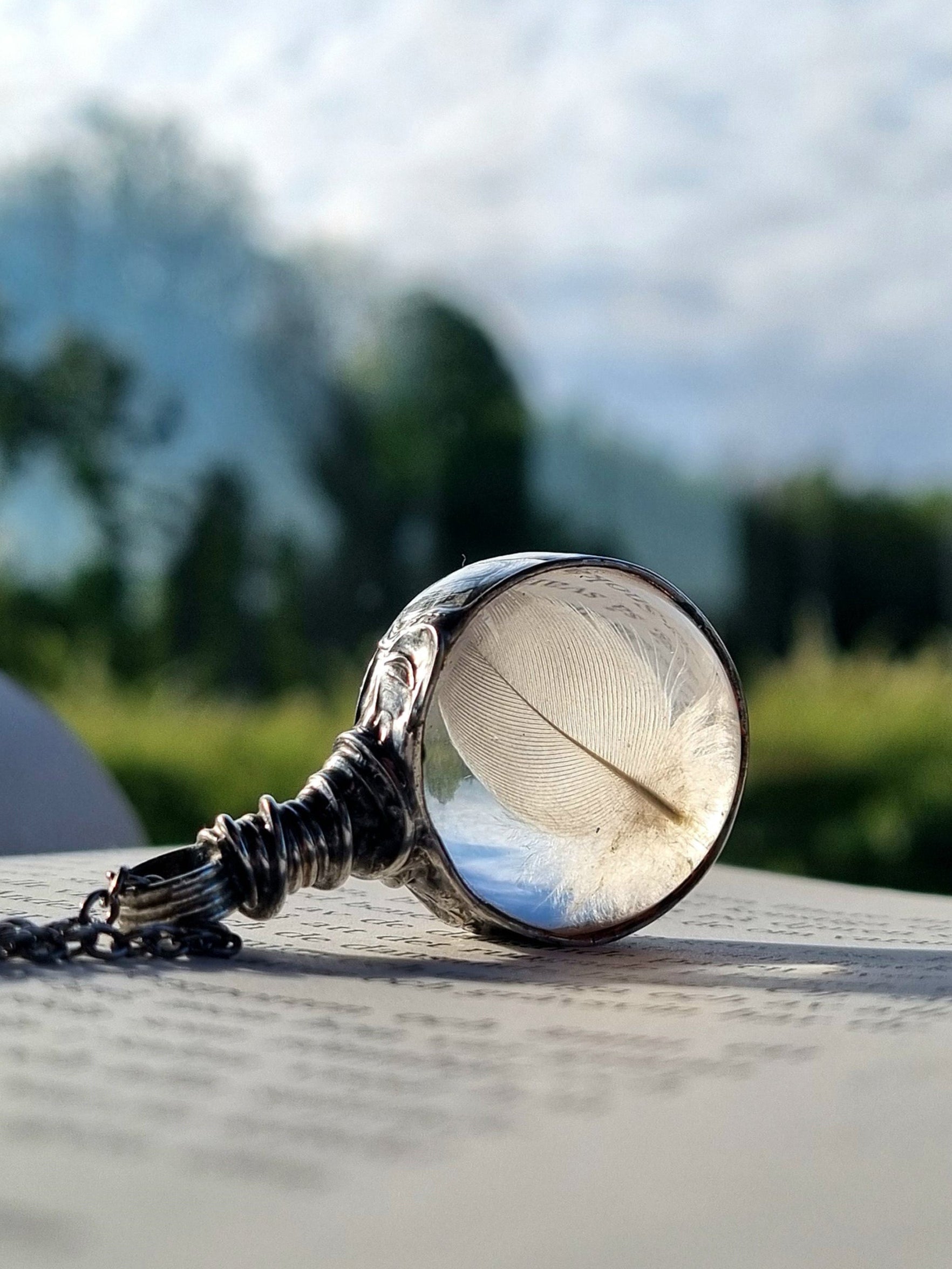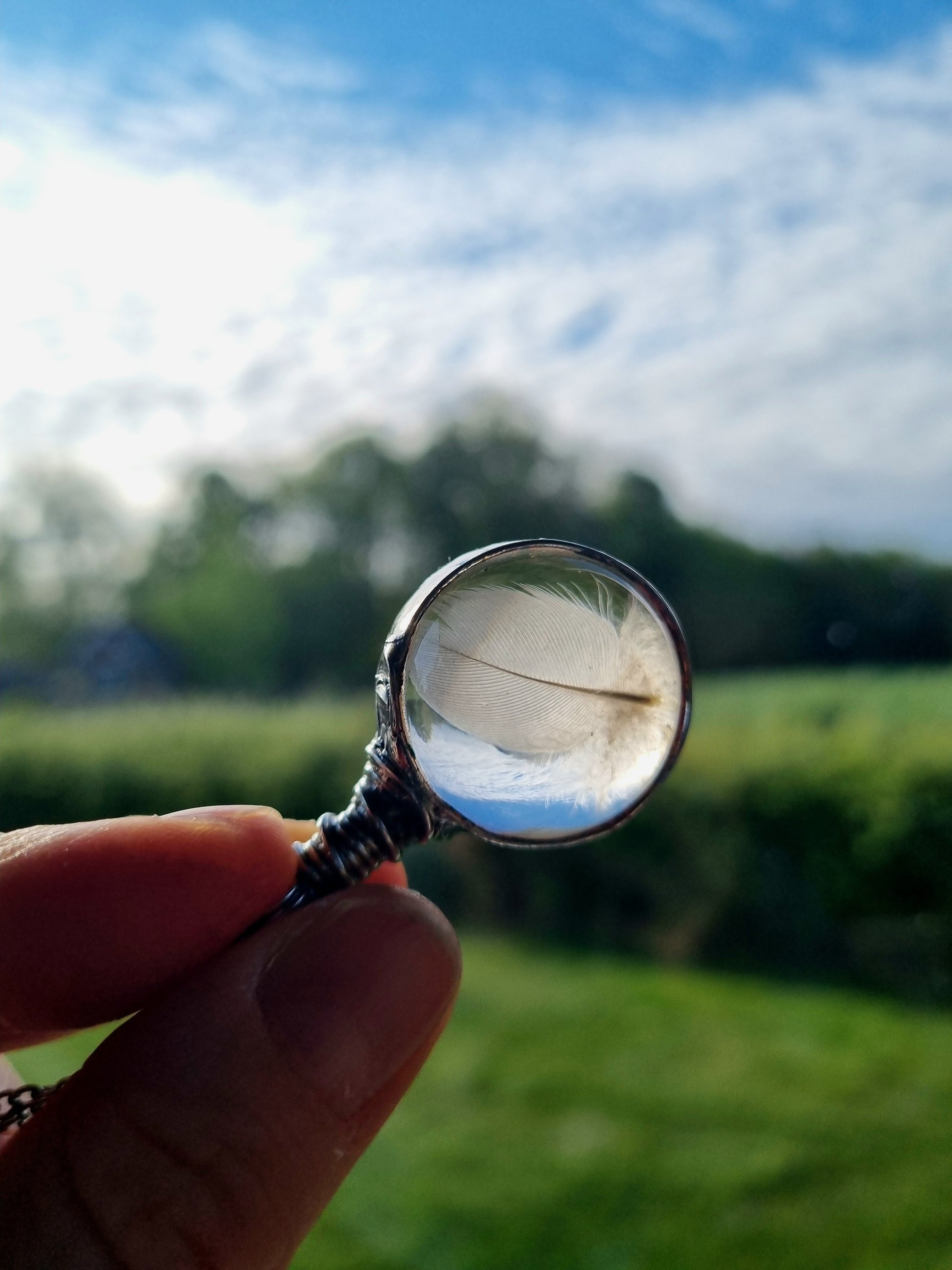 A single down feather, light as air, rests between two convex glass halves, creating a magnifying, almost magical effect.