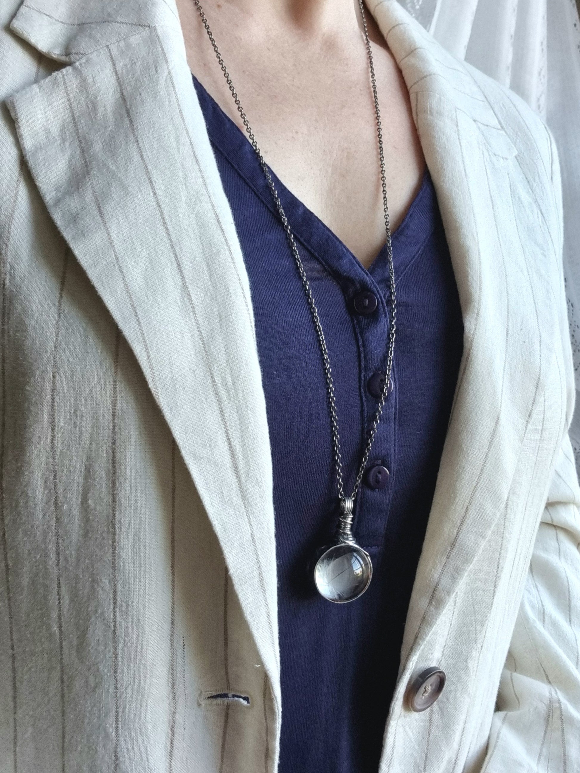 Each pendant is crafted with care using copper, eco-friendly tin, and clear glass. The metal is styled to resemble aged silver, lending a timeless, rustic elegance to the piece.