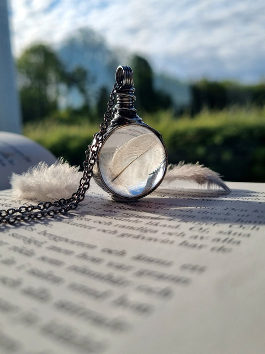 Bird Feather necklace, Down terrarium pendant.